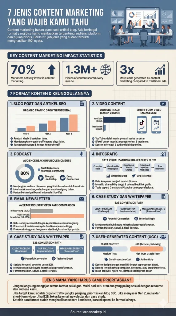 Content marketing bukan cuma artikel di web. Ada berbagai format yang bisa kamu manfaatkan tergantung audiens, platform, dan tujuan bisnis.