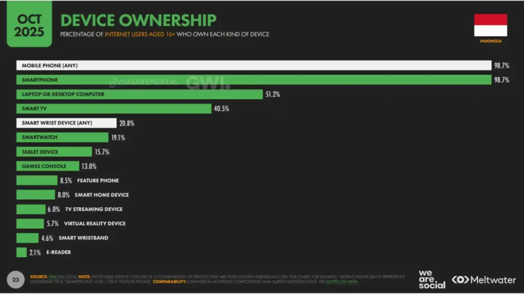 Laporan digital Indonesia 2026 menguatkan tren tersebut. 98% pengguna internet mengakses internet lewat ponsel, sementara hanya sekitar 51% yang menggunakan laptop atau desktop.